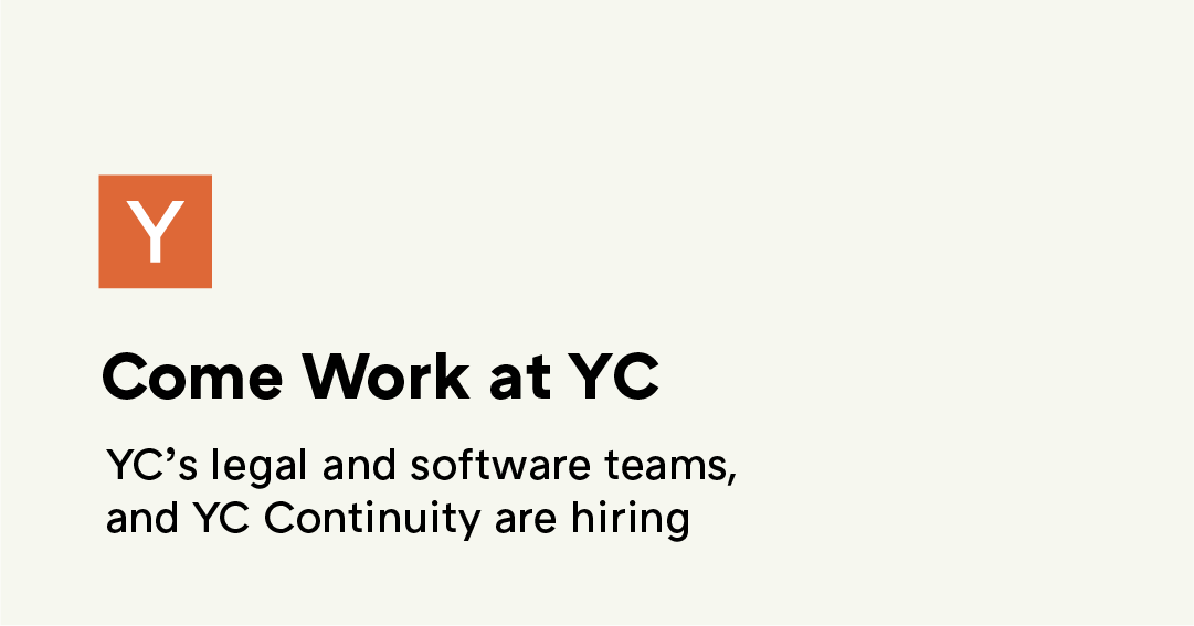 Y Combinator’s legal and software teams, and YC Continuity are hiring. Learn more about the open roles below: