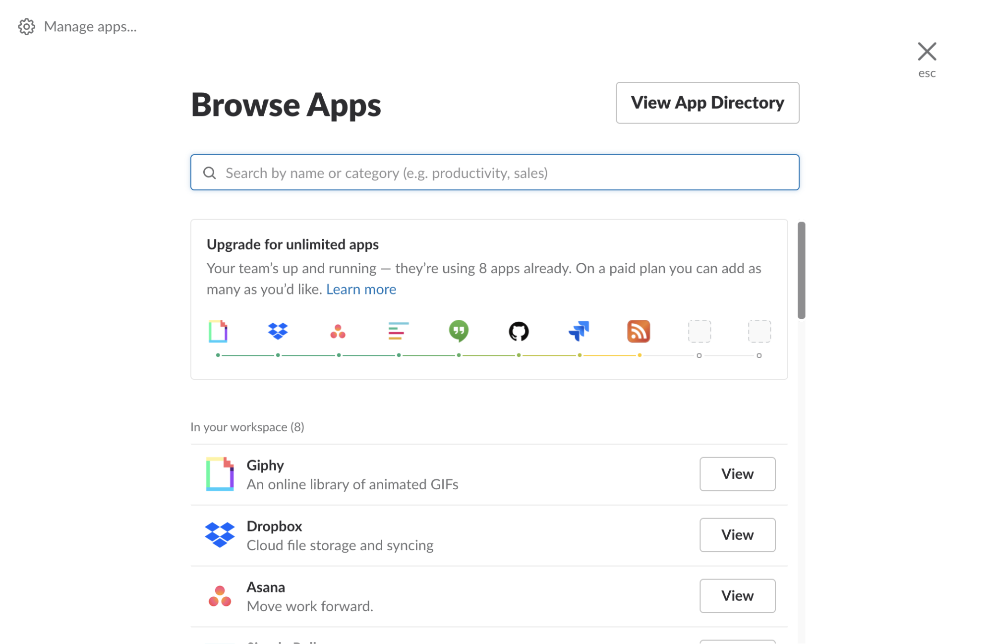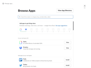 For example, Slack promotes its app integration options on its “Browse Apps” page, telling users how they can improve their productivity. The module encourages users to explore the feature and add their favorites apps, while subtly implying that they can only use up to 10.