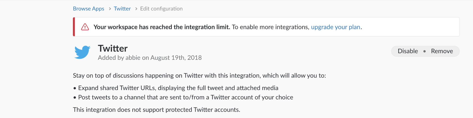 Before the user has learned the value of Slack app integration, the call to action is to “Add apps to get things done” and links to app integration education. However, as the user adds integrations, this language shifts toward monetization, changing to “Upgrade for unlimited apps.” At this point, the user has likely found value in the feature and is ready for your contextual upgrade messaging. Finally, when the user attempts to add their 11th integration, they are hit with a timely paywall.